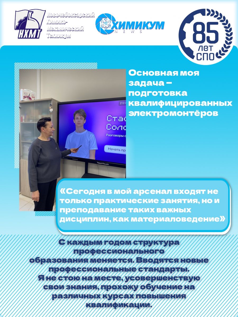 - «Более тридцати лет моей жизни связано с профессией мастера производственного обучения. Я начала свой путь в профессиональном училище №9, где передала знания многим молодым людям. Сейчас продолжаю свою работу в стенах Новочебоксарского химико-механического техникума. Через мои руки прошло огромное количество студентов, многие из которых уже успешно работают по своей специальности. Моя главная цель — подготовить квалифицированных специалистов-электромонтеров, которые смогут уверенно обслуживать и ремонтировать электрическое оборудование.
