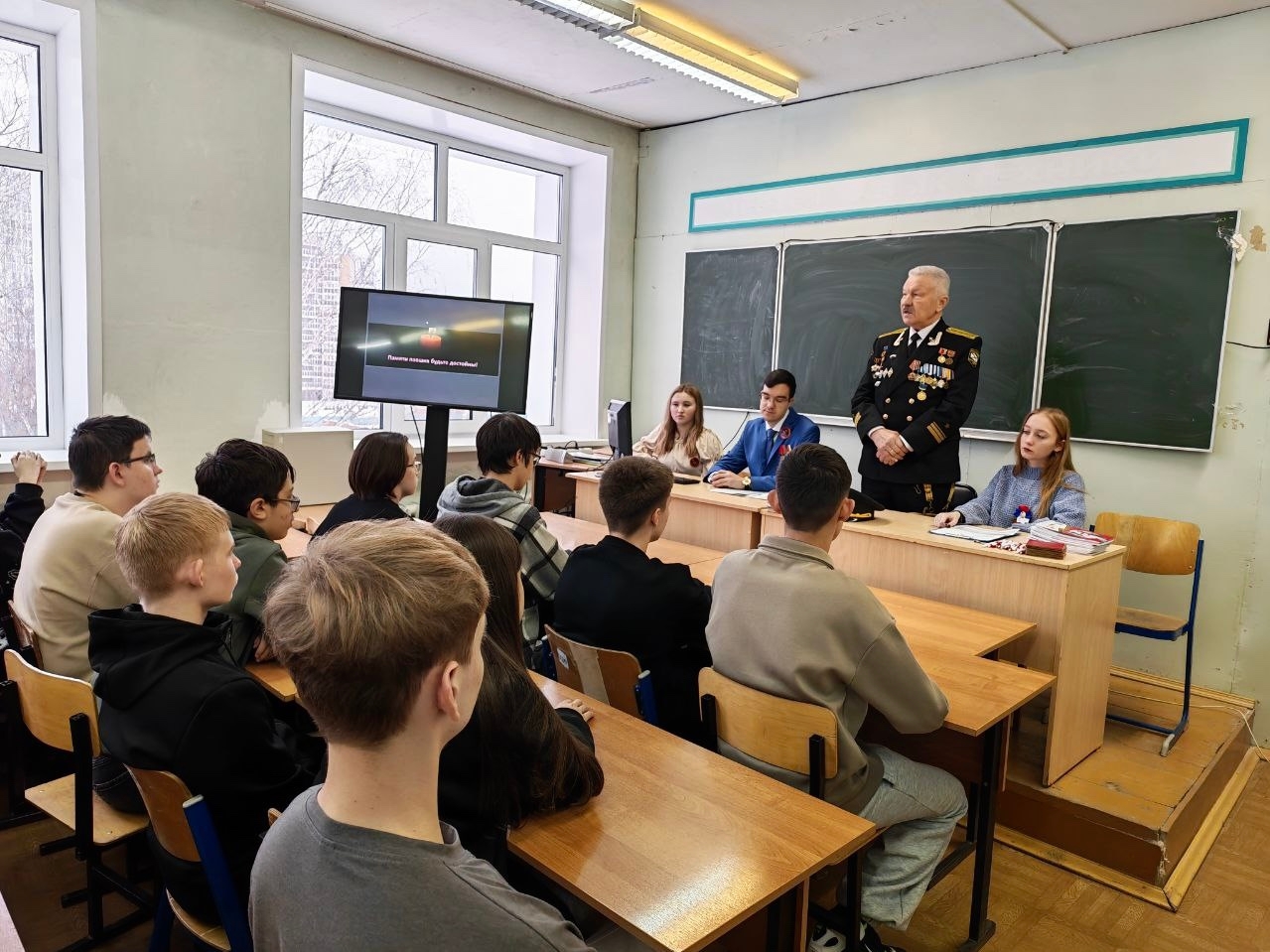 О подвиге моряков рассказал заместитель Председателя Чувашского отделения «Российского Союза Ветеранов» капитан-лейтенант Лаврентьев Василий Михайлович. Затем он вручил знак Поискового отряда «Пламенные сердца» вновь принятому в ряды поисковиков Сабинину Даниилу, студенту группы 11МЭТО.